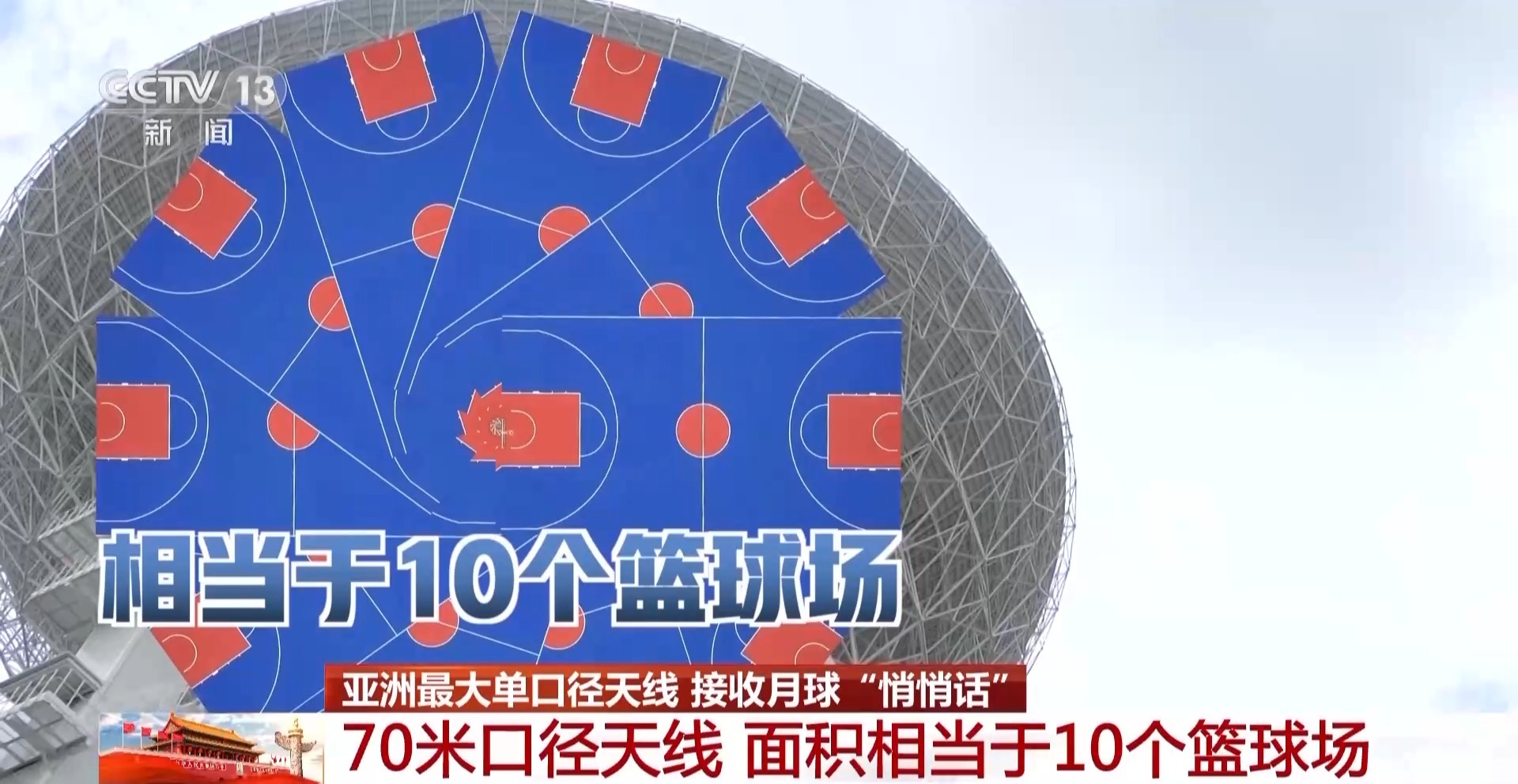 在这个70米口径天线的内部,第一感觉就是非常大。天线所采用的反射面板,它的面积有4560平方米,相当于10个篮球场的大小,天线的高度有72米,重量有2700吨,主要承担探月、探火等深空探测任务的数据接收。