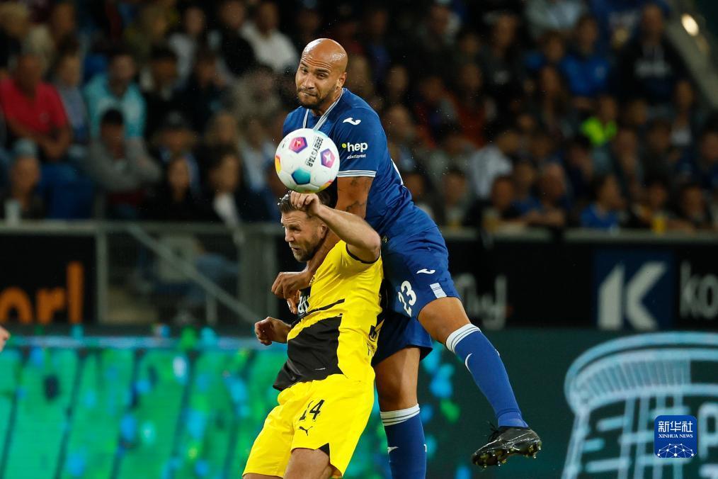 9月29日,霍芬海姆队球员布鲁克斯(上)与多特蒙德队球员菲尔克鲁格在比赛中争顶。新华社发(约阿希姆·毕瓦勒兹 摄)