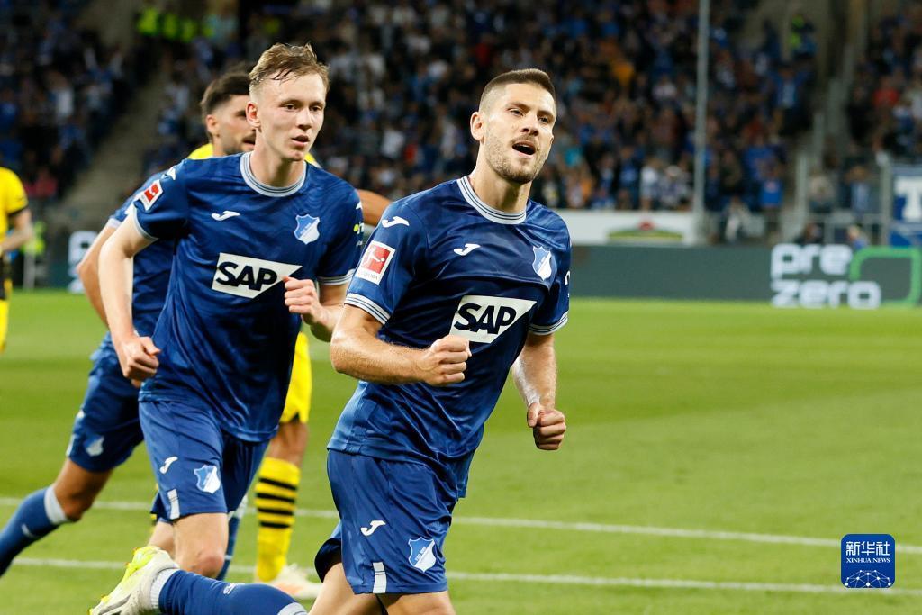 9月29日,霍芬海姆队球员克拉马里奇(右)进球后与队友庆祝。新华社发(约阿希姆·毕瓦勒兹 摄)