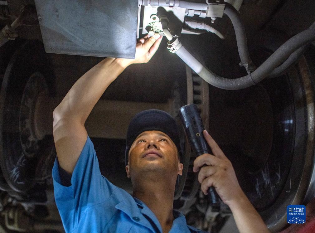 马耀锋在检查动车车底撒砂系统的外观状态(9月26日摄)。