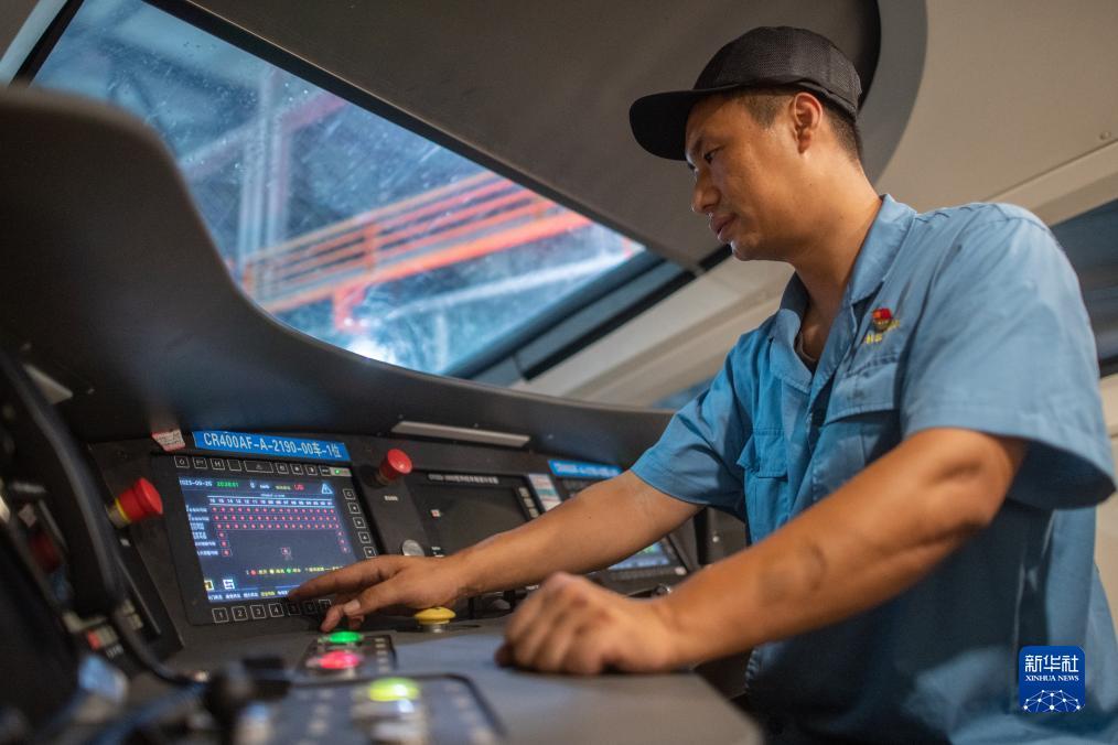 马耀锋在驾驶室检查动车车辆信息数据(9月26日摄)。
