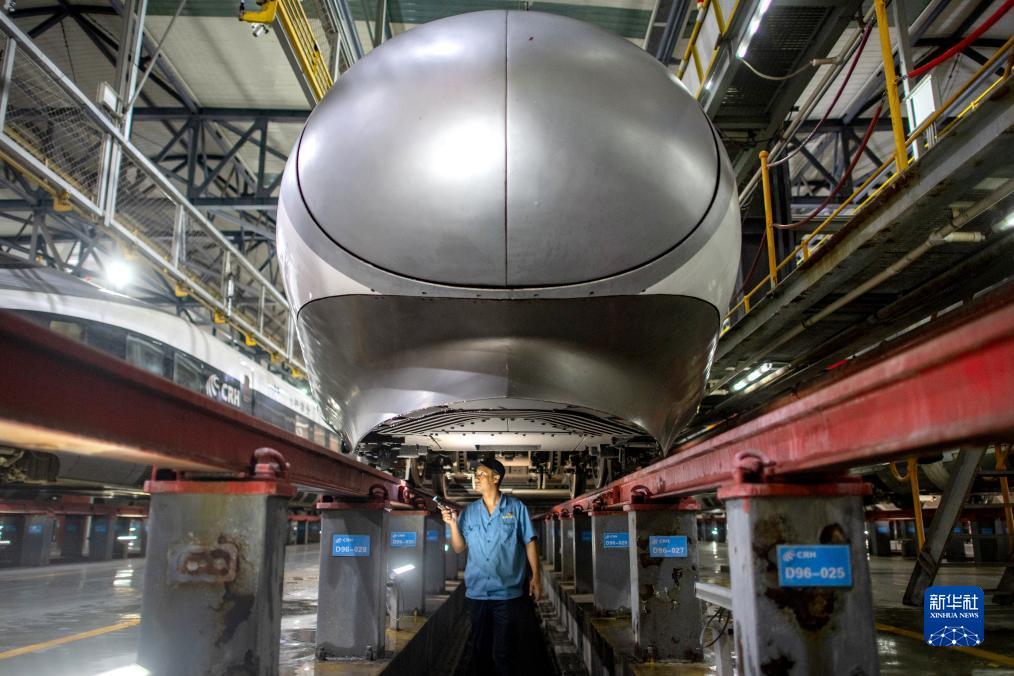 马耀锋在检查动车车体外观状态(9月26日摄)。