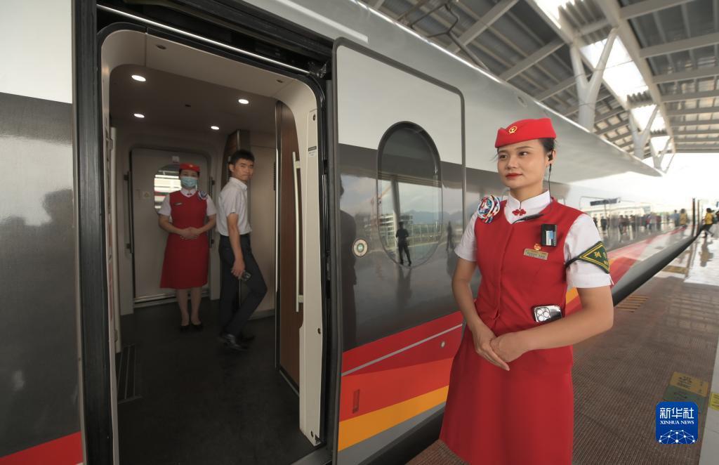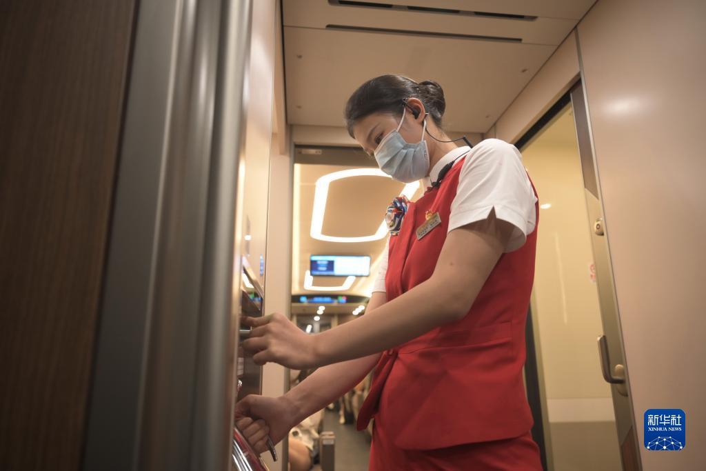 首发车G9801次列车长车艳雪和她的同事登上福厦高铁复兴号智能动车组为乘客服务。“在列车上我们要用心用情做好服务,让乘坐福厦高铁的乘客在旅行中享受到不一样的跨海之旅,展现我们海上‘高姐’的风采。”车艳雪说。