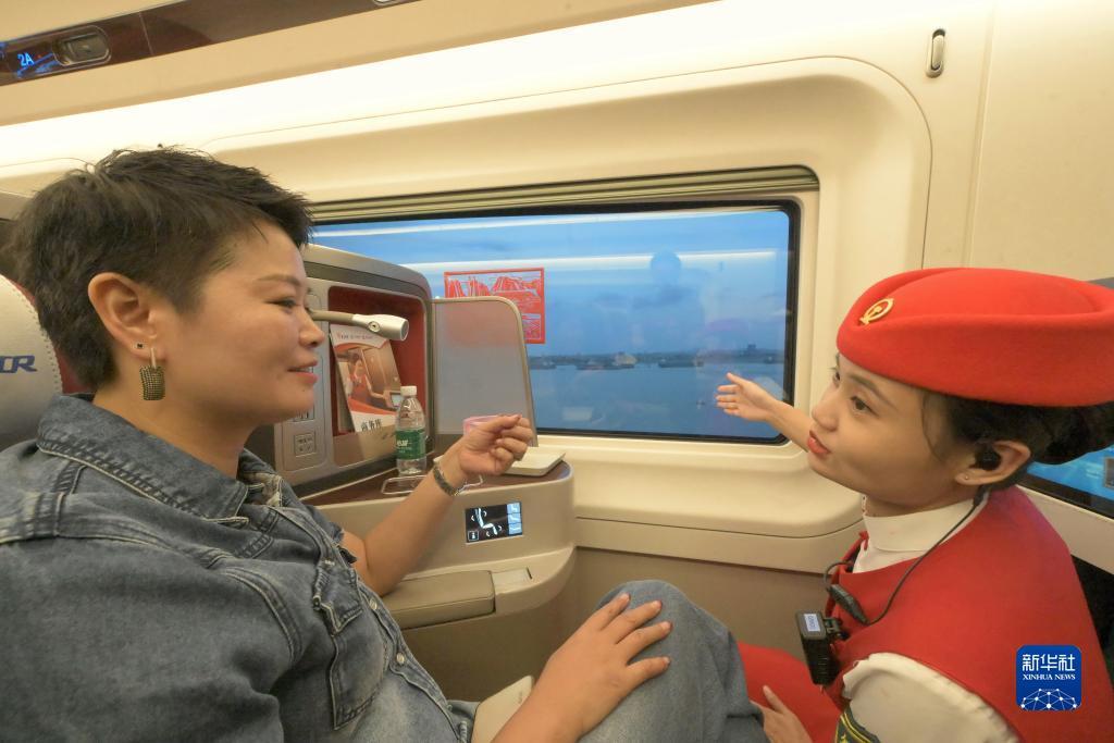 9月28日,G9801次复兴号智能动车组经过泉州湾跨海大桥时,列车长车艳雪(右)向旅客介绍福厦高铁泉州湾的海上风光。