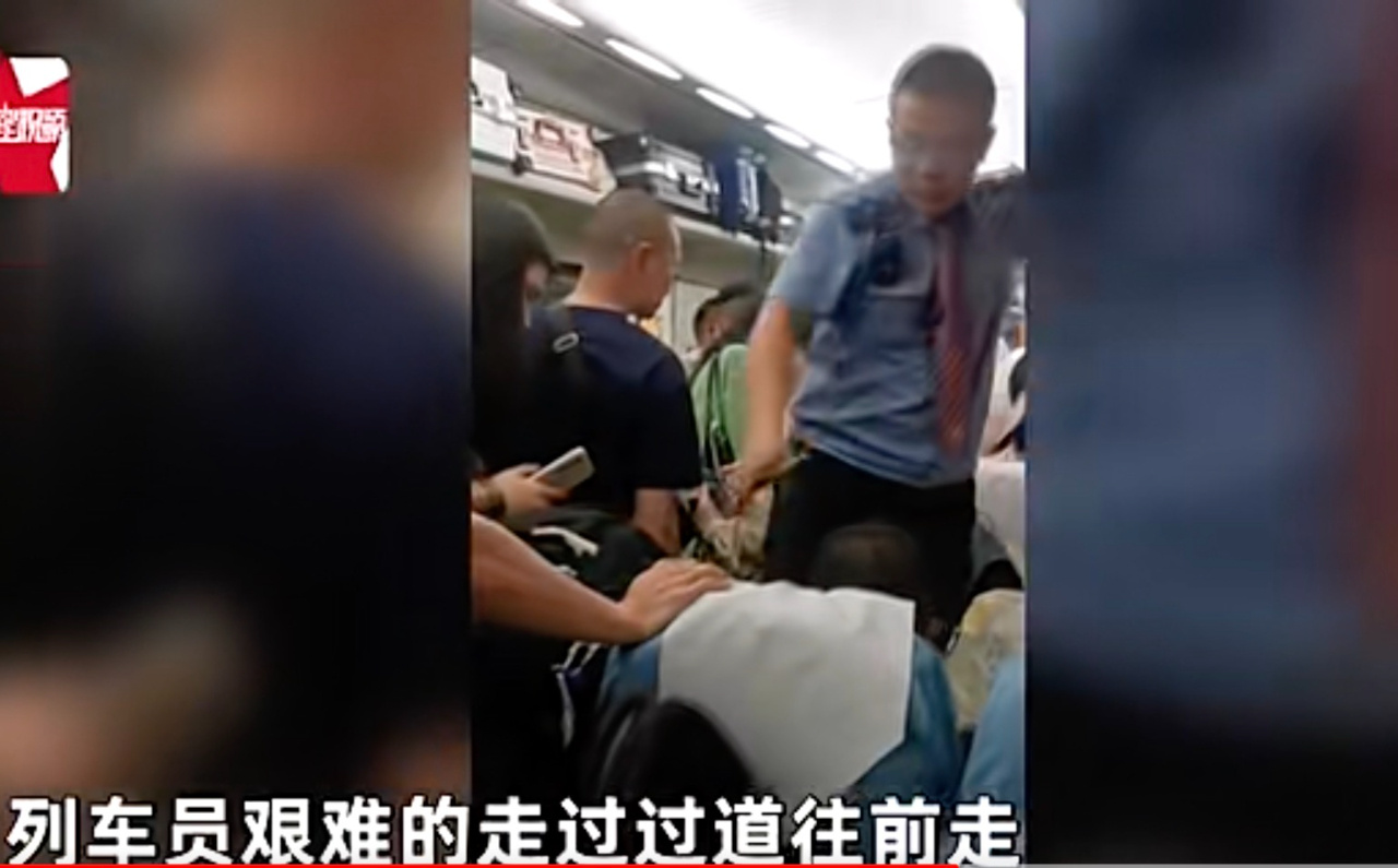 而在另一趟火车上,由于车厢内的过道也站满了乘客,列车员艰难走过过道往前走,在拥挤的人群中穿梭。
