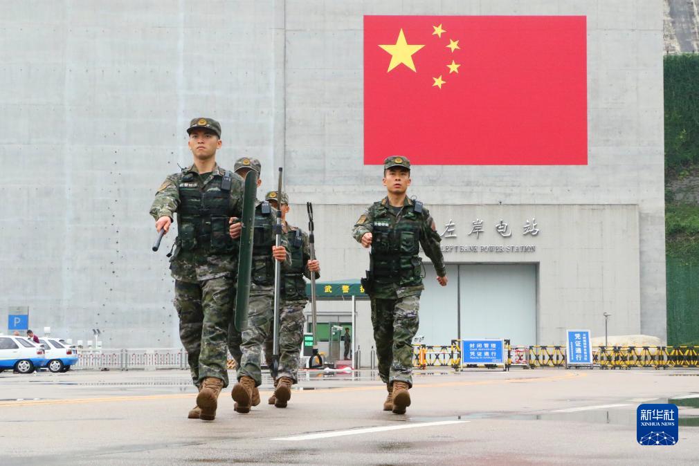 10月1日,武警湖北总队宜昌支队官兵在三峡大坝警戒巡逻。