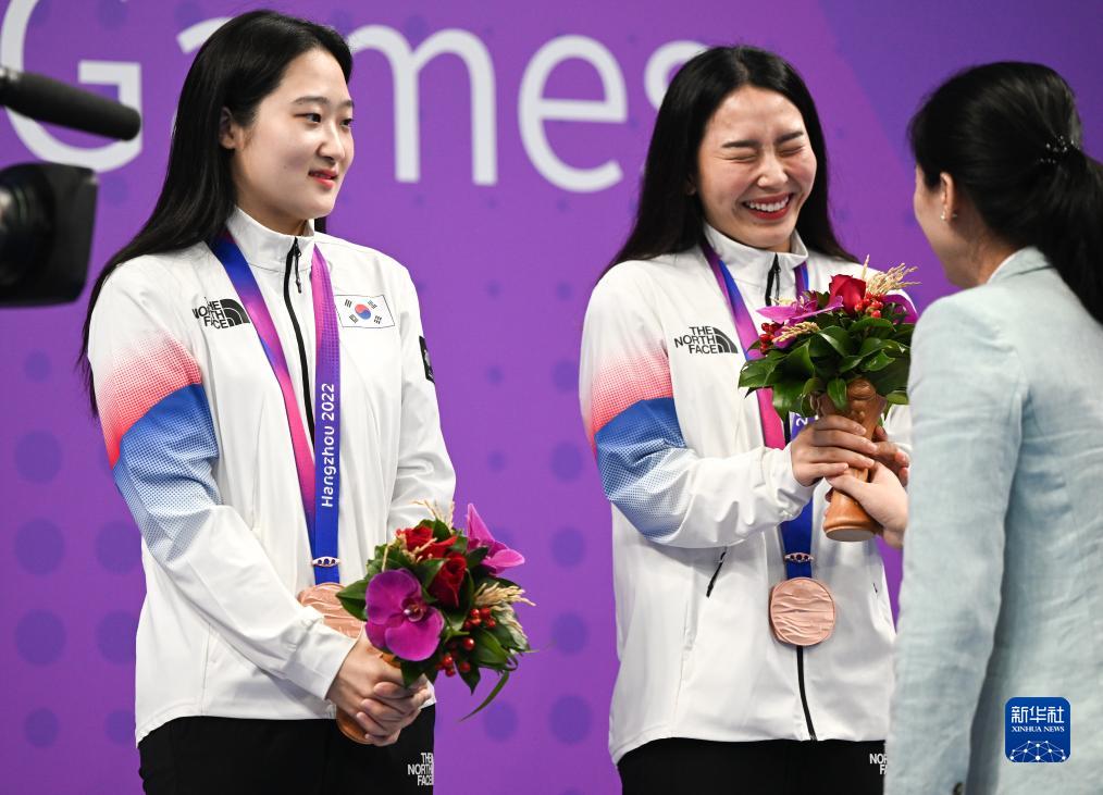 10月1日,季军韩国组合朴河天(左)/金守志在颁奖仪式上。