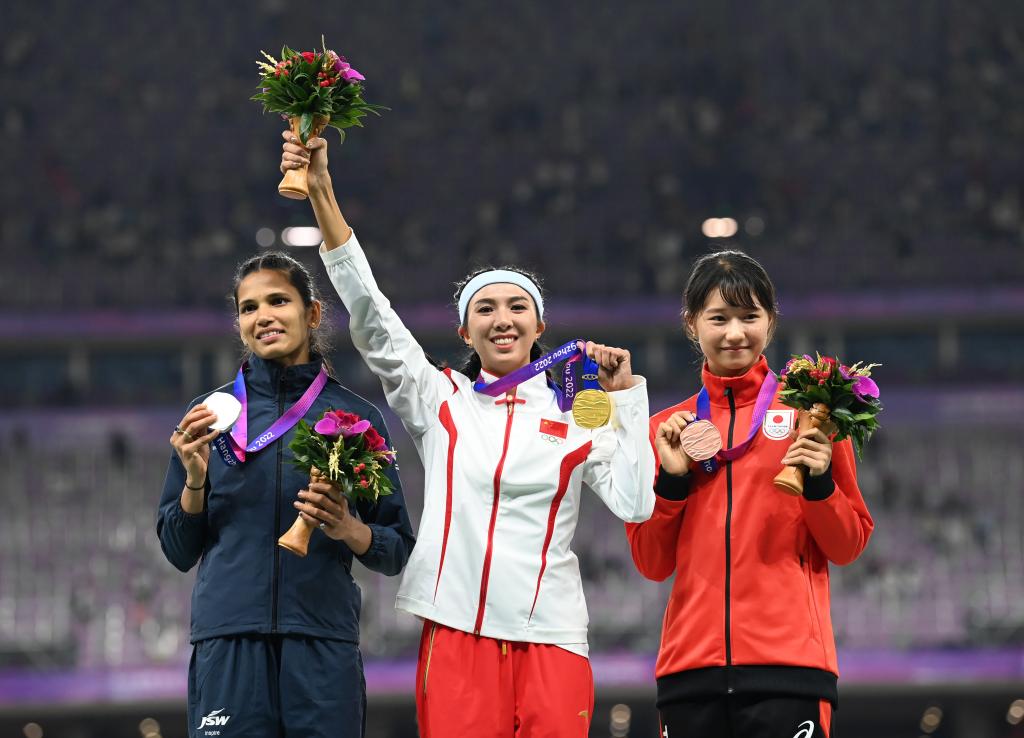 10月1日,冠军中国选手林雨薇(中),亚军印度选手乔蒂·亚拉吉(左)和季军日本选手田中佑美在颁奖仪式上。新华社记者 江汉 摄