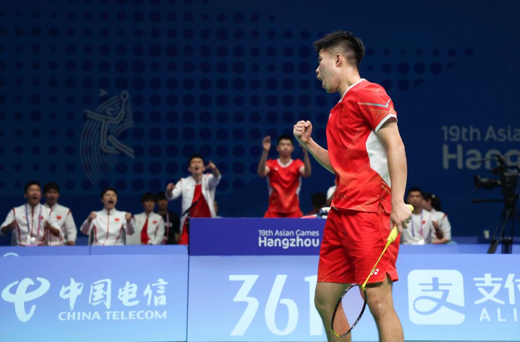 新华社杭州10月1日电(记者张逸飞、许仕豪、牛梦彤)翁泓阳高举双臂,与冲进场内的队友依次拥抱,随后中国队队员在场地中间围成一圈,肆意庆祝这场来之不易的胜利。在国庆节当日,国羽男队经过一场306分钟的鏖战,在先失两分的绝境下连扳三城,逆转印度队,夺得男团冠军,这也是杭州亚运会上中国军团在羽毛球项目上收获的首枚金牌。
