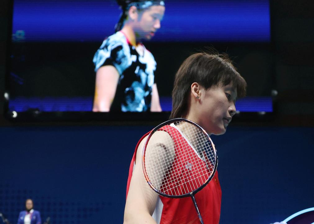 10月1日,中国选手陈雨菲在单打比赛中。她以0:2不敌韩国选手安洗莹。新华社记者 陈斌 摄