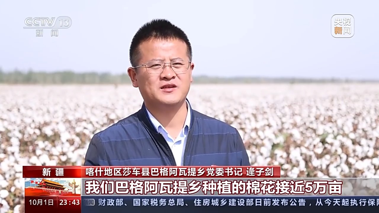 喀什地区莎车县巴格阿瓦提乡党委书记 逄子剑:我们巴格阿瓦提乡种植的棉花接近5万亩,产量高,品质好,我们现在正在对接国家棉花产业联盟,促进我们跟后端市场直接接轨,提高棉花的单产价格,增加群众的收入。