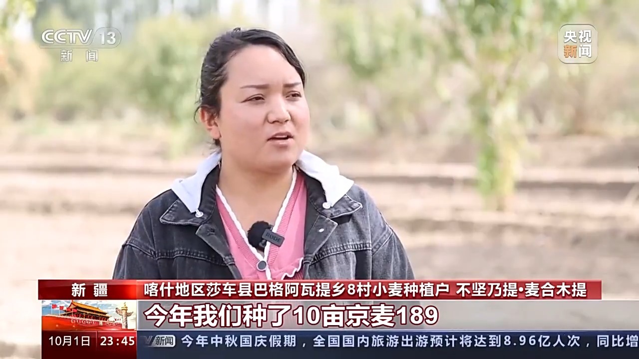 喀什地区莎车县巴格阿瓦提乡8村小麦种植户 不坚乃提•麦合木提:今年我们种了10亩京麦189, 这个品种特别好,与老品种相比,一亩地能多收150公斤小麦和麦草,能多卖500块钱。