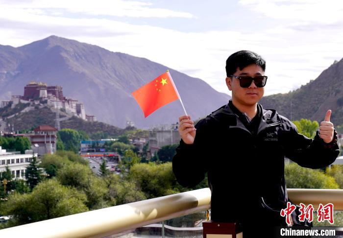 图为游客在西藏博物馆与远处布达拉宫合影留念。拉巴卓玛 摄