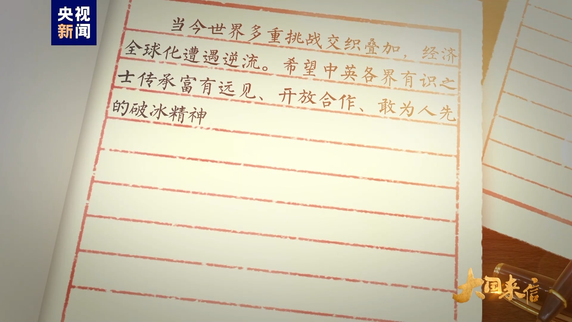 当今世界多重挑战交织叠加,经济全球化遭遇逆流。希望中英各界有识之士传承富有远见、开放合作、敢为人先的破冰精神,奋力开拓合作共赢新局面,推动构建开放型世界经济,为促进中英友好合作作出更大贡献。
