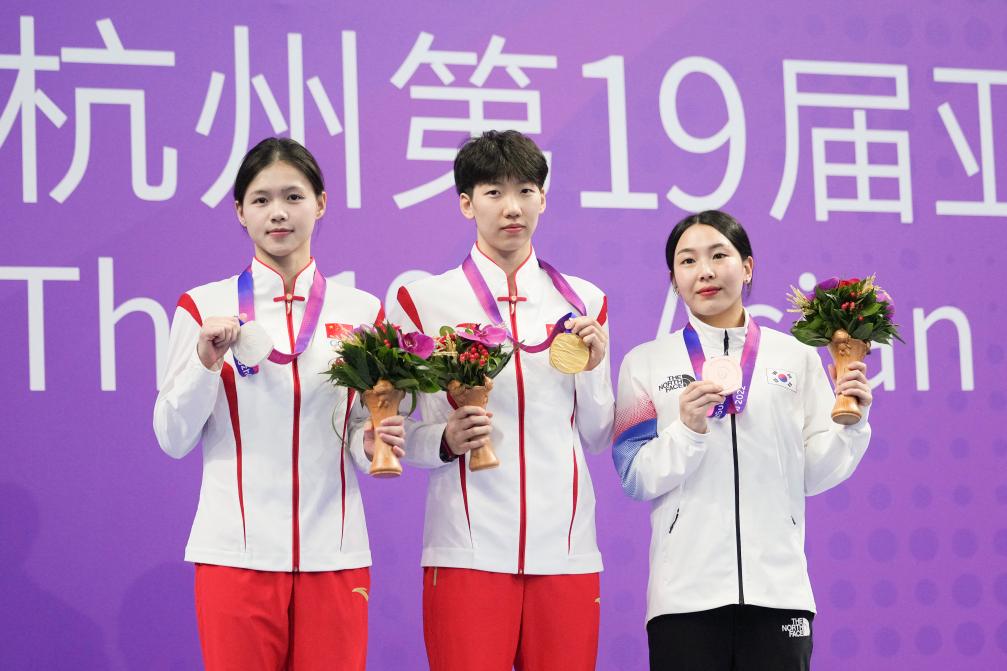 新华社杭州10月2日电(记者夏亮、周欣、李嘉)中国跳水队在本届亚运会上的“金牌收割”仍在继续。在2日进行的男、女1米板决赛中,中国队分别包揽冠亚军。