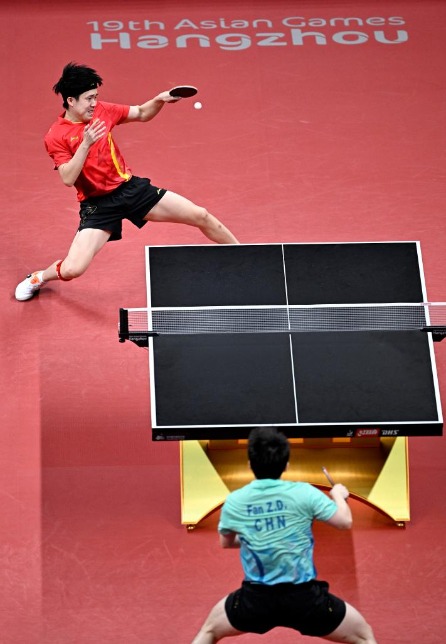 第四局,樊振东以11:7获胜,双方大比分战成2:2。第五局,王楚钦打得更加积极主动,以11:4获胜。第六局,背水一战的樊振东在5:5后连续得分,最终以11:7获胜,双方战至3:3。决胜局,王楚钦在7:7后连得3分,率先获得赛点,并最终以11:8获胜,首次赢得亚运会男单冠军。