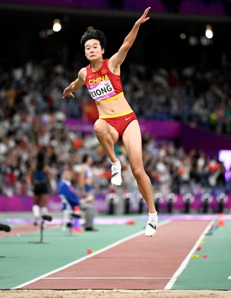 在女子跳远赛场,中国19岁小将熊诗麒凭借第三跳跳出的个人最好成绩6米73,将冠军收入囊中,为中国队收获当日第二金。