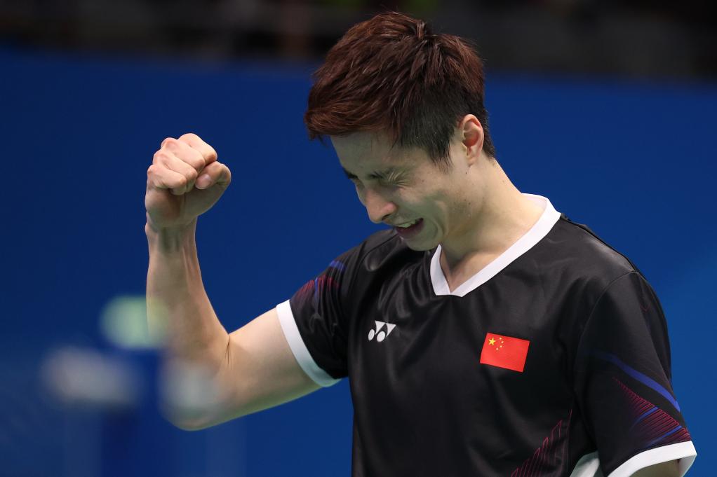 10月3日,石宇奇庆祝比赛获胜。新华社记者陈斌摄