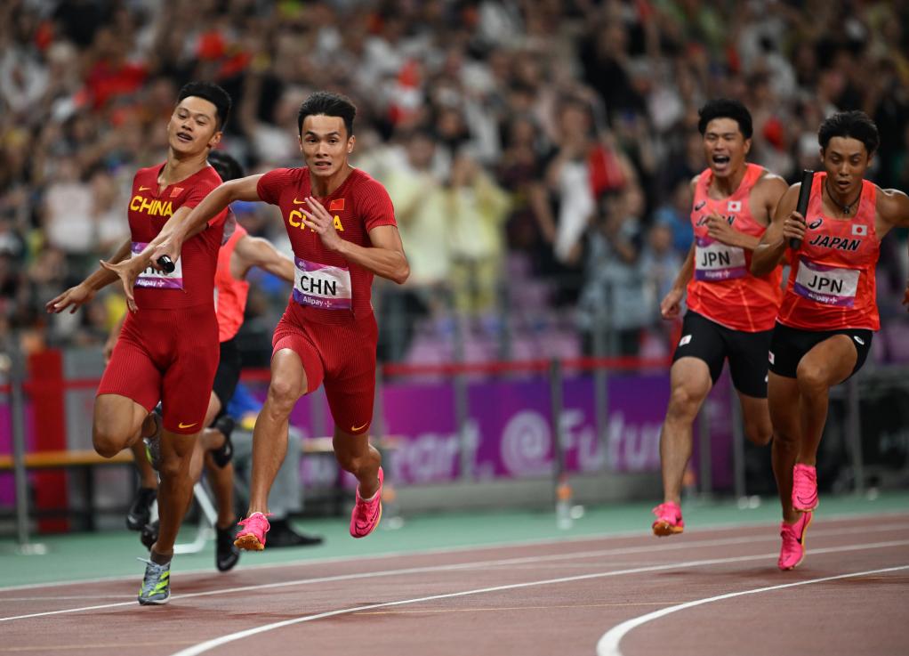 新华社杭州10月3日电(记者张泽伟 王恒志)中国队继续扬威亚运赛场,3日收获当天28枚金牌中的14枚。亚洲男女“飞人”谢震业和葛曼棋分别领衔,帮助中国队包揽男子和女子4X100米接力金牌,“中国速度”燃爆全场。而在“三大球”中,中国男篮和女篮都继续着前进的步伐,但中国女足却被日本队挡在了决赛大门之外。