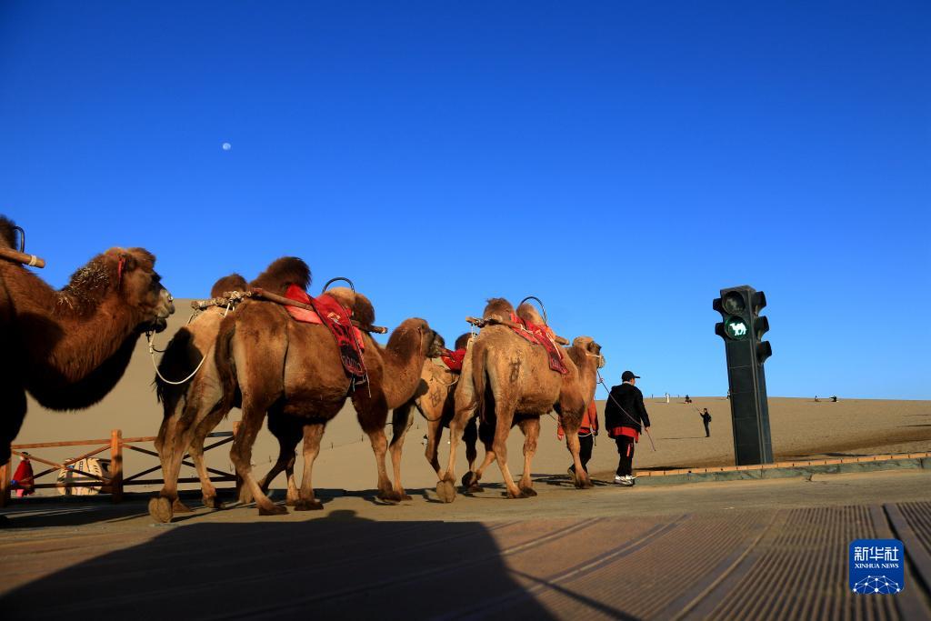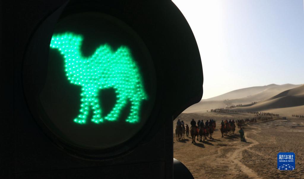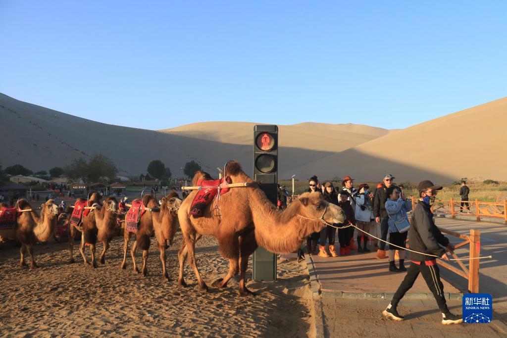 10月2日,甘肃省敦煌市鸣沙山月牙泉景区的交通信号灯“骆驼绿灯”亮时,农户牵着骆驼有序通过。