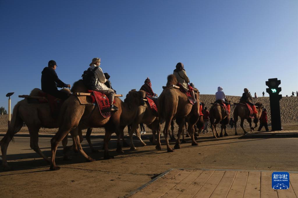 10月2日,游客在甘肃省敦煌市鸣沙山月牙泉景区体验骑骆驼。