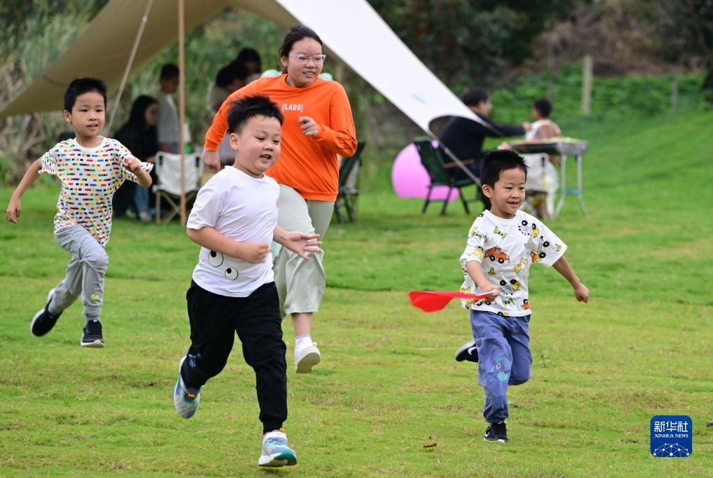 10月3日,小朋友在江苏省淮安市金湖县吕良镇三园村一处农庄追逐玩耍。