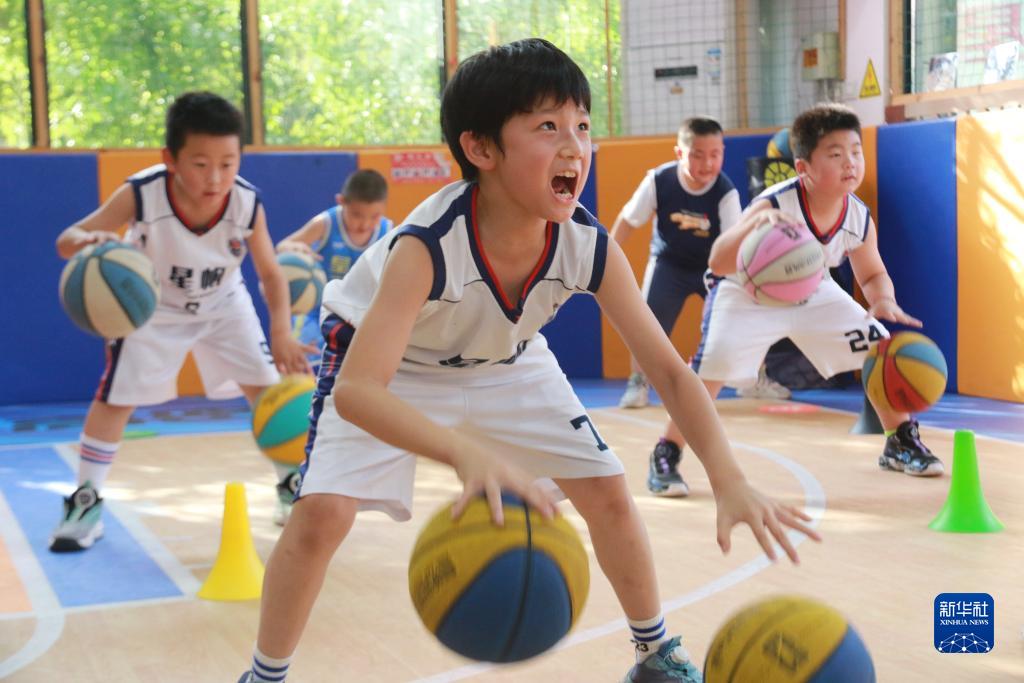 10月2日,孩子们在山东省高密市一篮球训练营进行篮球基本功训练。