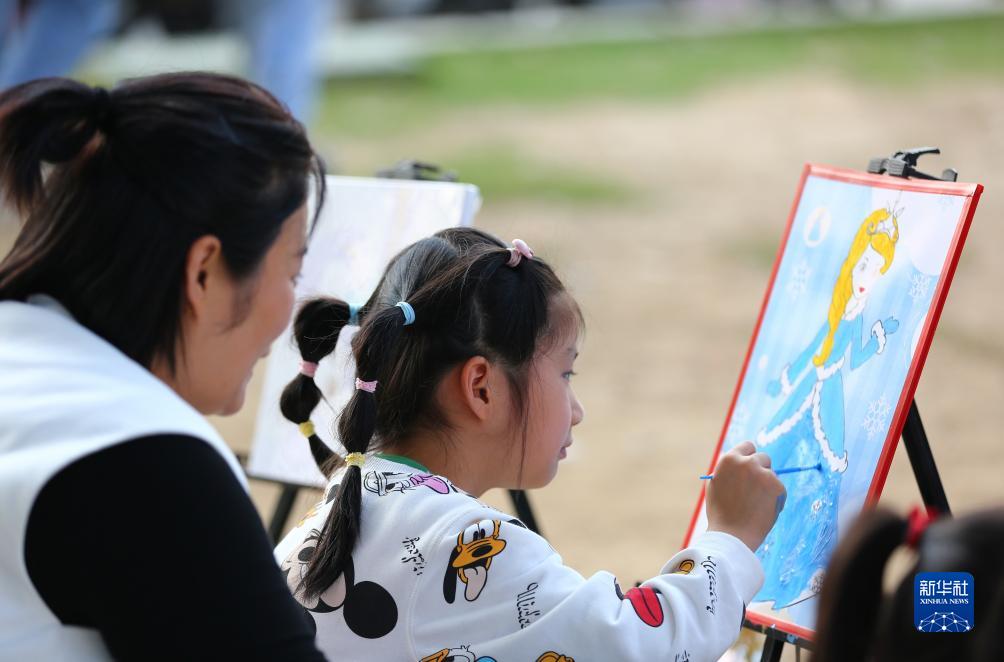 10月3日,家长陪着孩子在山东省滕州市弘道公园学习绘画。