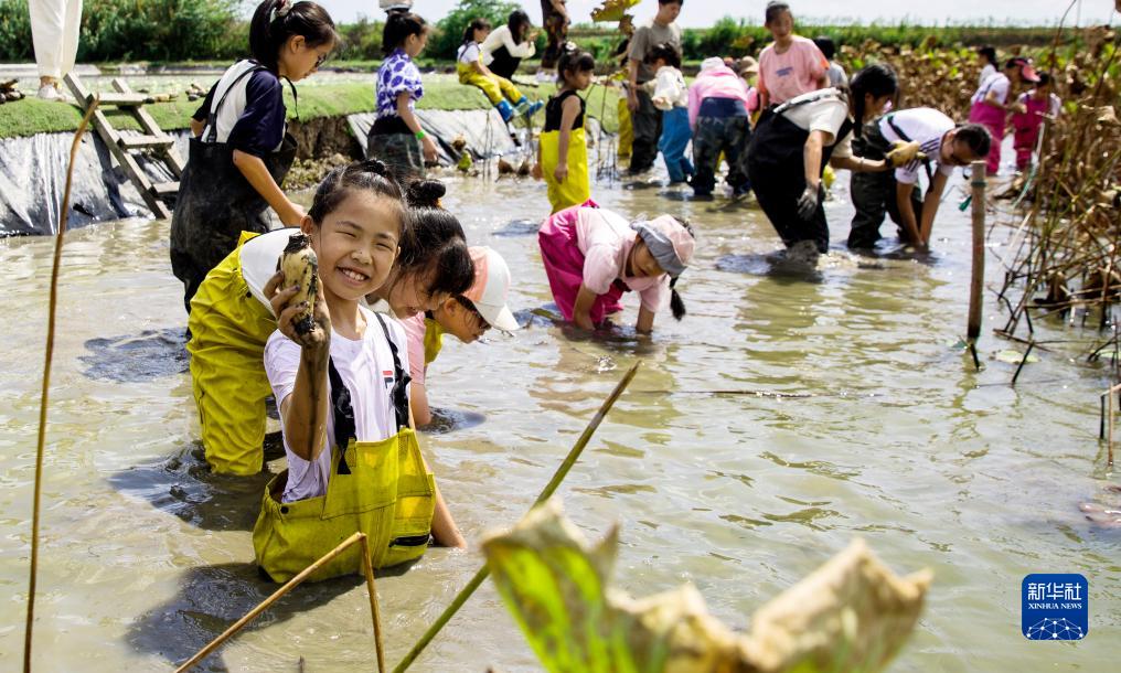 10月3日,小朋友在浙江省宁波市北仑区郭巨街道古镇莲园体验采收莲藕。