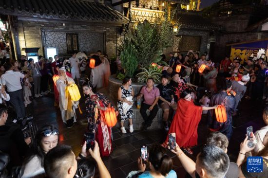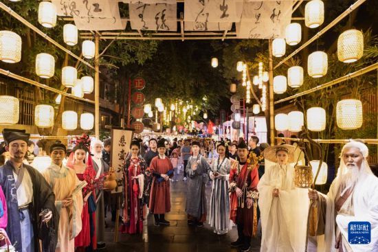 在成都宽窄巷子新“十二月市”街区,装扮成唐宋时代人物形象的演员在巡游表演(9月29日摄)。