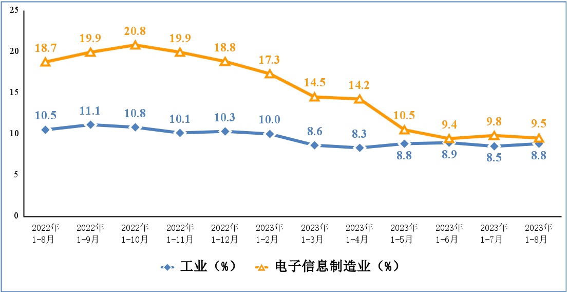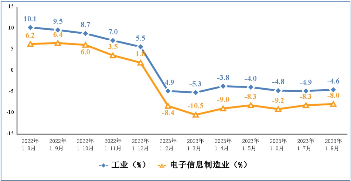 1—8月份,规模以上电子信息制造业增加值同比增长0.9%,增速较1—7月份提高0.8个百分点;增速分别比同期工业、高技术制造业低3个和0.9个百分点。8月份,规模以上电子信息制造业增加值同比增长5.8%。