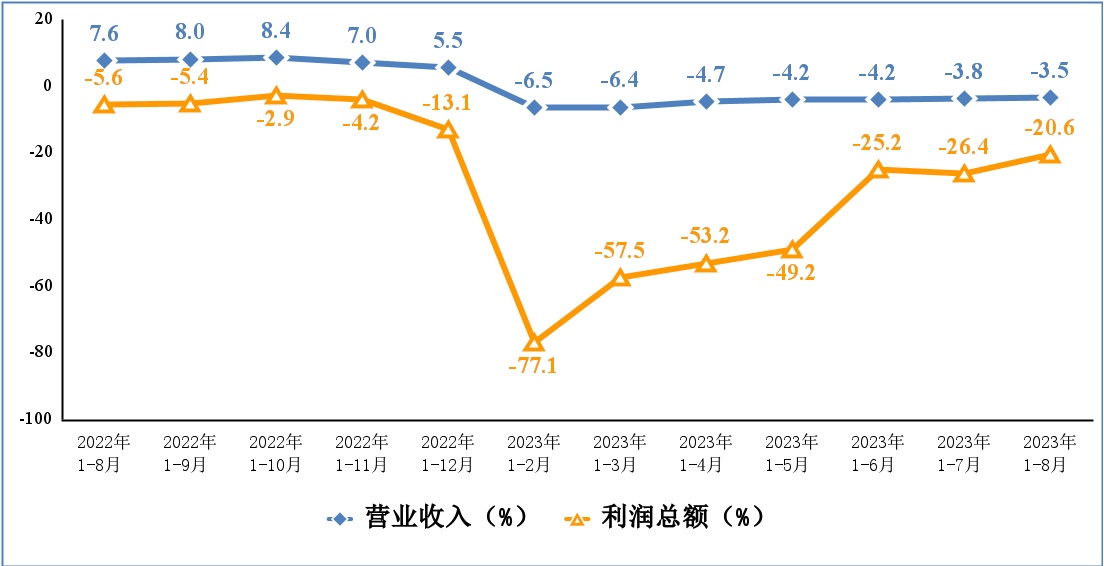1—8月份,规模以上电子信息制造业实现营业收入9.21万亿元,同比下降3.5%,较1—7月份降幅收窄0.3个百分点;营业成本8.06万亿元,同比下降3%;实现利润总额3547亿元,同比下降20.6%,较1—7月份降幅收窄5.8个百分点;营业收入利润率为3.9%,较1—7月份上升0.4个百分点。