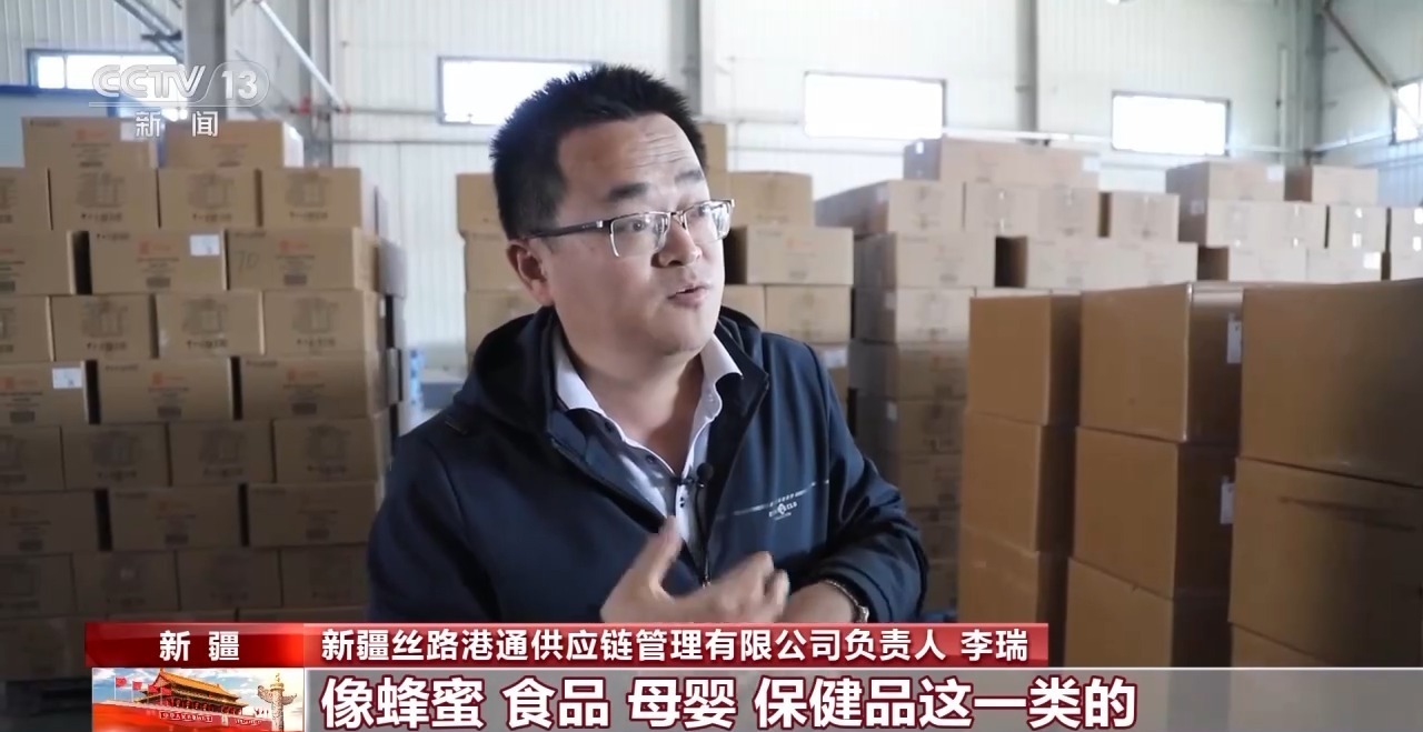 新疆丝路港通供应链管理有限公司负责人 李瑞:我们中国出去的这些产品,主要是衣服、鞋帽、3C(认证的)电子、扫地机、吸尘器、平板电脑、音箱、耳机等等,进口的主要是国外的这些像蜂蜜、食品、母婴、保健品这一类的。