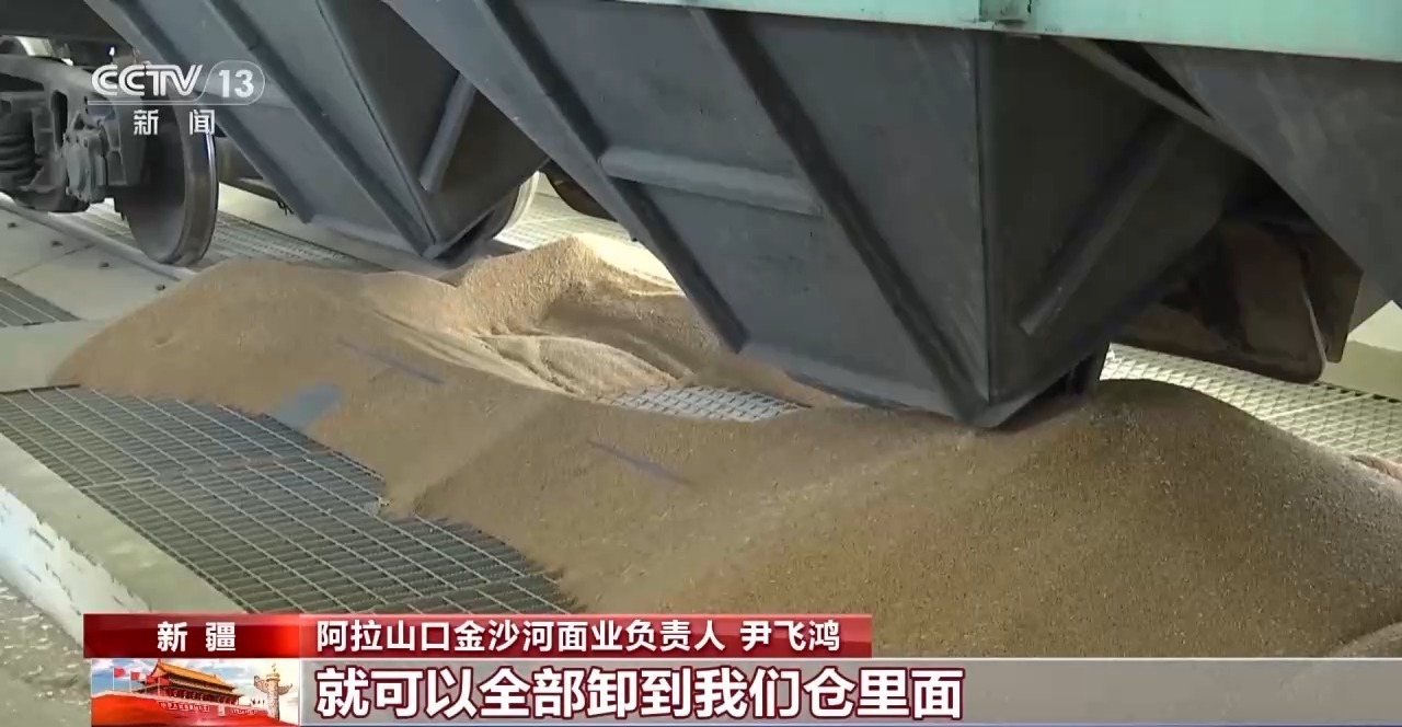 阿拉山口金沙河面业负责人 尹飞鸿:综保区有散粮专用线。在这的话,就是这一列车皮,基本上不超过10个小时就可以全部卸到我们仓里面。