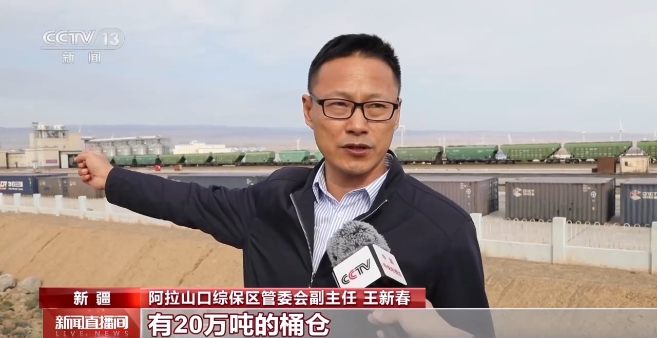 阿拉山口综保区管委会副主任 王新春:新建了我们这个粮食物流中心,有20万吨的桶仓,和我们这个年换装能力300万吨的这个粮食换装线。吸引了很多的这种从事粮食、油料、饲料加工这一类企业落地。