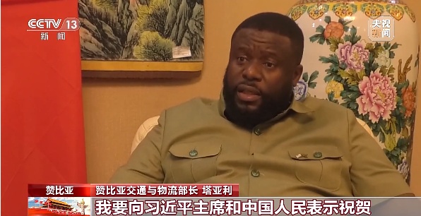 赞比亚交通与物流部长 塔亚利:我要向习近平主席和中国人民表示祝贺,热烈祝贺中华人民共和国成立74周年,祝愿中国今后能够不断发展。