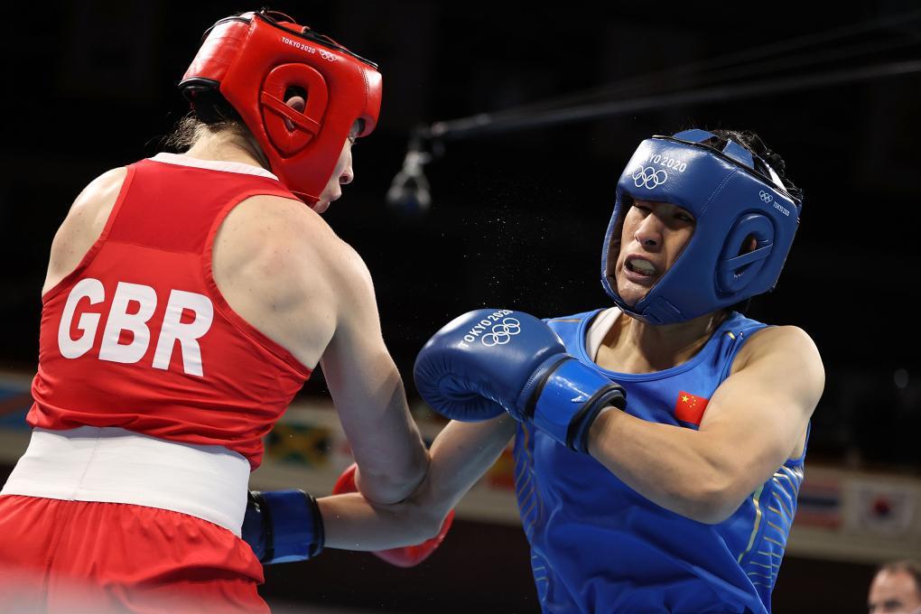 2021年8月8日,在东京奥运会拳击女子75公斤级决赛中,李倩(右)不敌英国选手普赖斯,获得银牌。新华社记者 欧东衢 摄