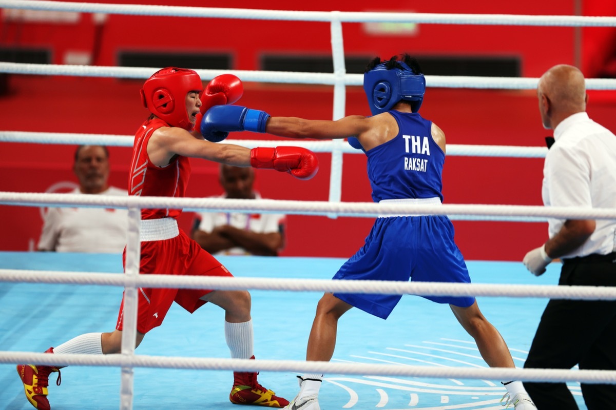 10月3日,杭州亚运会女子50公斤级决赛,中国女拳手吴愉(左)对战泰国拳手楚他玛·拉沙。最终,吴愉以5:0击败对手,夺得本届亚运会拳击项目的首金,并获得巴黎奥运会门票。