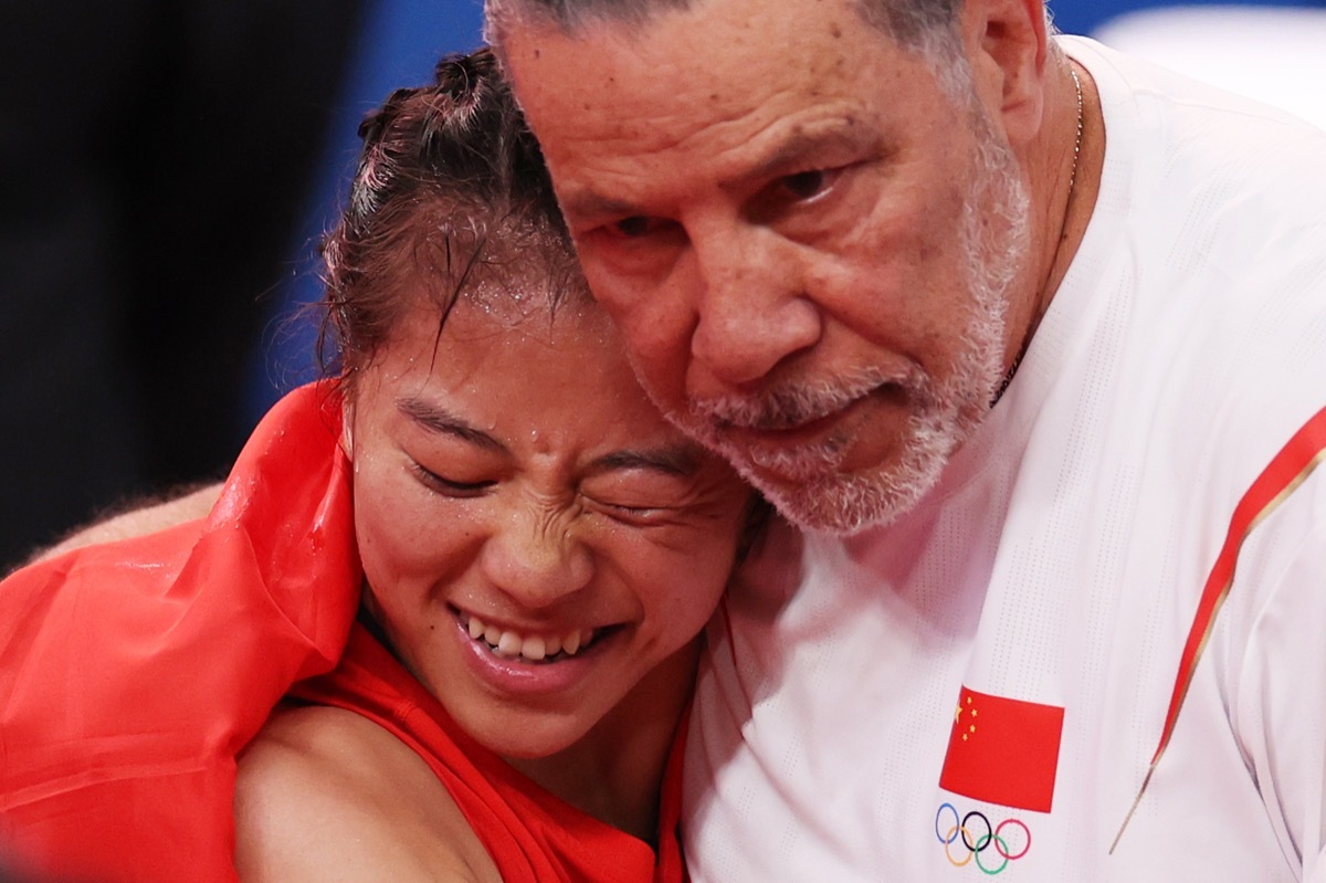 10月3日,杭州亚运会女子50公斤级决赛结束后,吴愉和来自古巴的教练劳尔拥抱庆祝。