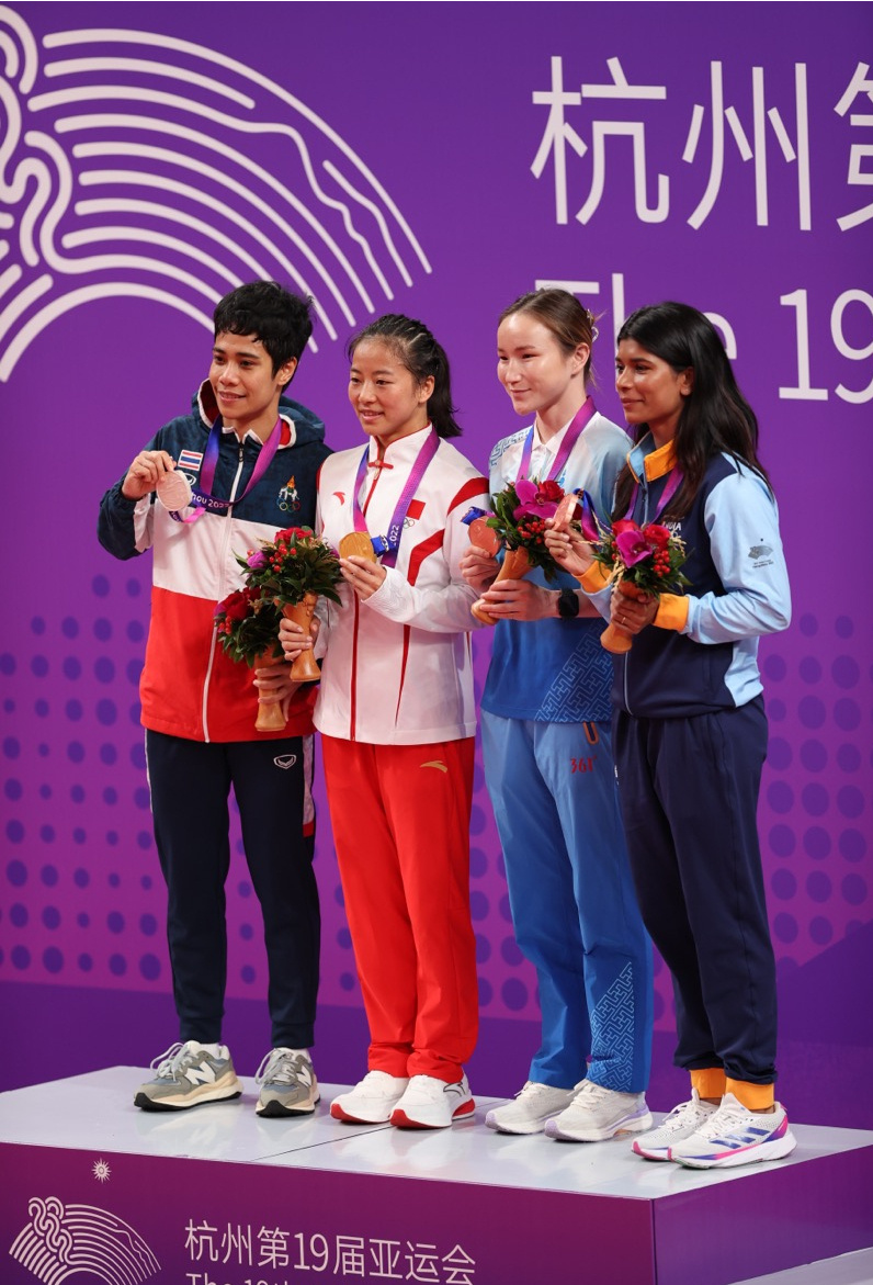 10月3日,杭州亚运会女子50公斤级决赛结束后,获得金牌的吴愉(左二)登上领奖台。(工人日报-中工网记者 吴凡 摄)