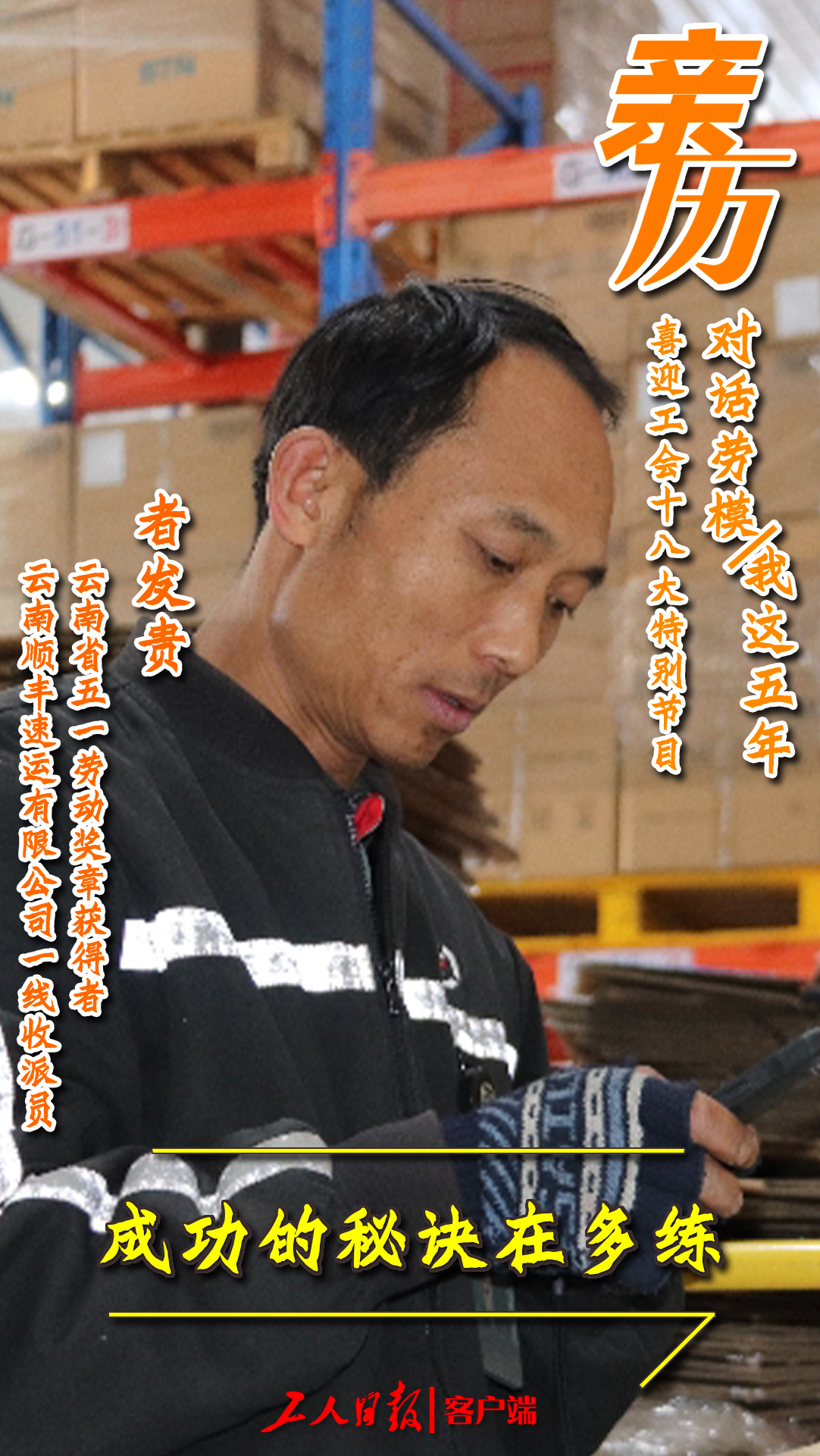 者发贵是云南顺丰速运有限公司的一线收派员,曾荣获昆明市2019年“点赞春城”代言人称号,2022年云南省五一劳动奖章,多次获得云南顺丰速运有限公司优秀收派员、顺丰速运集团优秀员工。今年是者发贵成为“顺丰小哥”的第16个年头。16年来,秉承着退伍军人的优秀品质,他倾心尽职对物品打包技术和服务质量提升工作刻苦钻研,精益求精,至今保持“0投诉”的记录;他热心“传、帮、带”200多名高徒都成为公司优秀快递员;他积极参加公司收派技能竞赛,取得骄人成绩和荣誉。他说:成功没有有捷径,就是多练、多想、多总结。