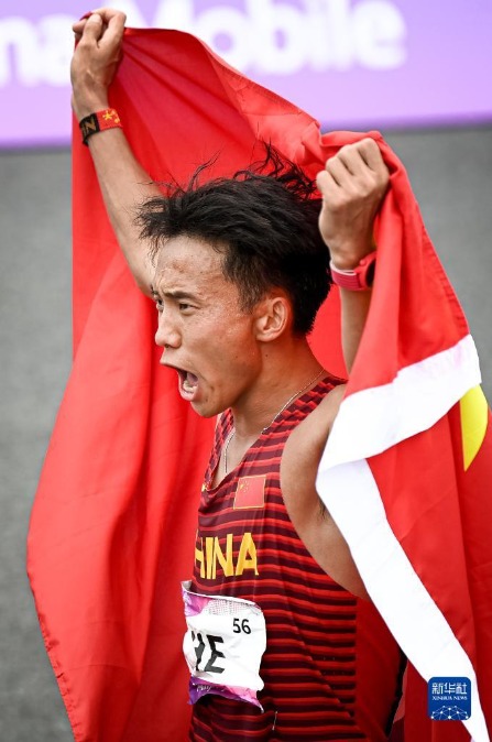 10月5日,中国选手何杰冲过终点线后庆祝。