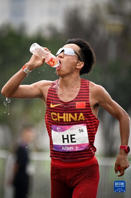 10月5日,中国选手何杰在比赛中补水。