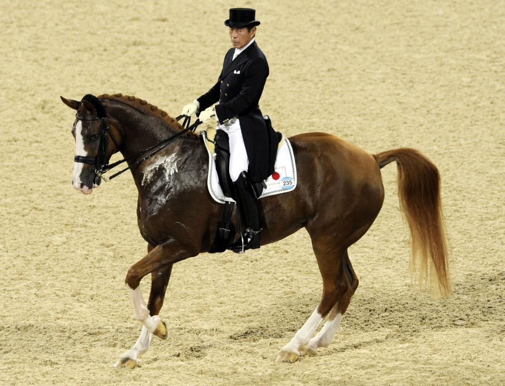 2008年8月14日,时年67岁的日本骑手法华津宽在北京奥运会比赛中。新华社记者 吕小炜摄