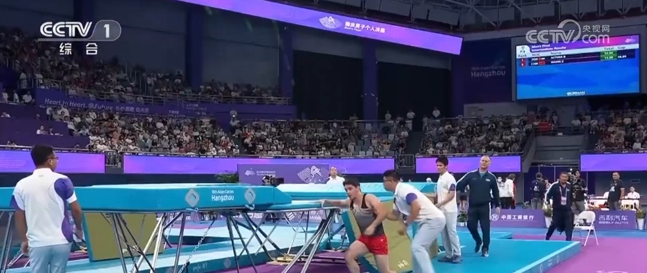 在蹦床男子个人决赛中,哈萨克斯坦运动员皮尔马马德·阿利耶夫因用力过猛、重心偏移,直接跳出了蹦床。现场的保护员们立即冲上前,所幸运动员无大碍。蹦床项目的保护员,如同游泳比赛的救生员,当运动员偏离床面时,保护垫可以起到第一层缓冲,守在赛场各个角落的保护员则提供第二层缓冲。