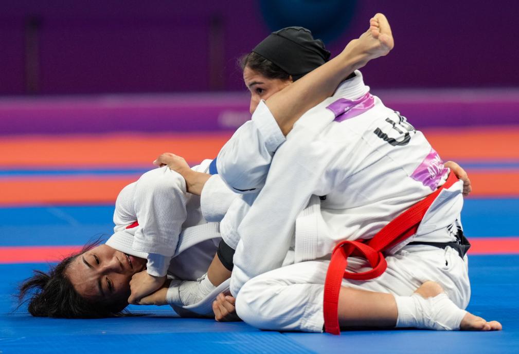 当日,36岁的苗婕自出场后便展现了不俗的竞技状态,凭借高质量的地面技术和位置把控,她先后击败三名来自印度、阿联酋、韩国的选手晋级决赛。