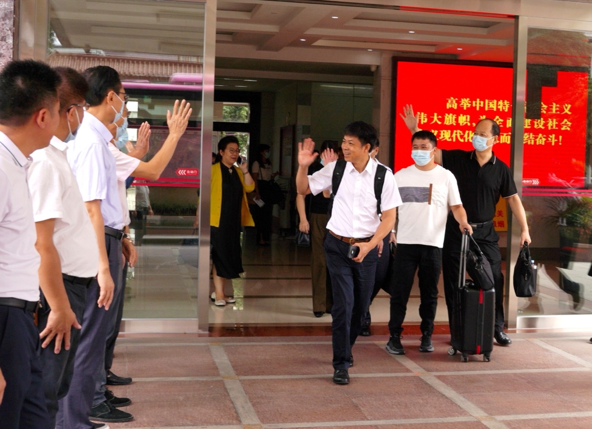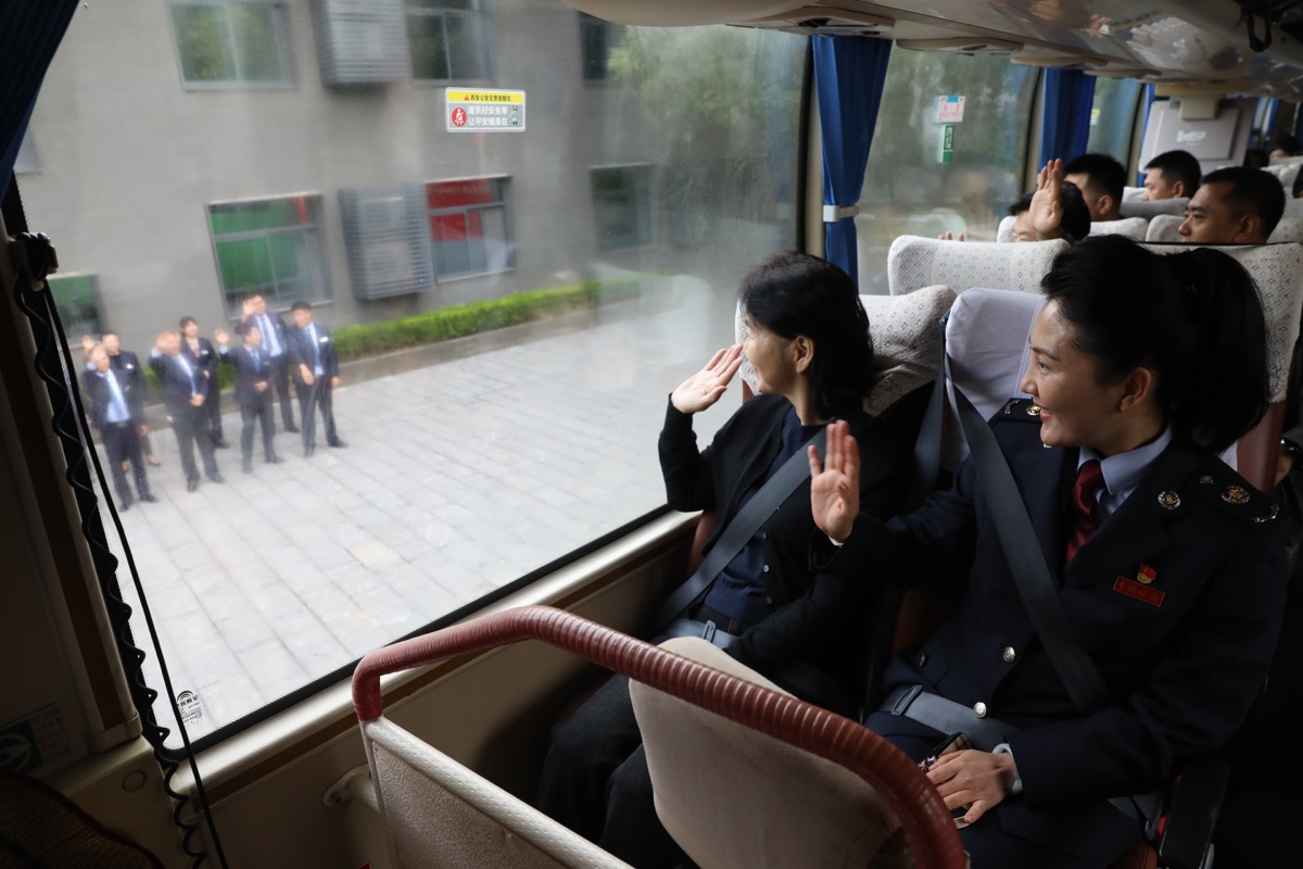 10月7日上午,陕西省出席中国工会十八大的代表们离陕进京前与工作人员挥手道别。(工人日报-中工网通讯员 鲜康 摄)