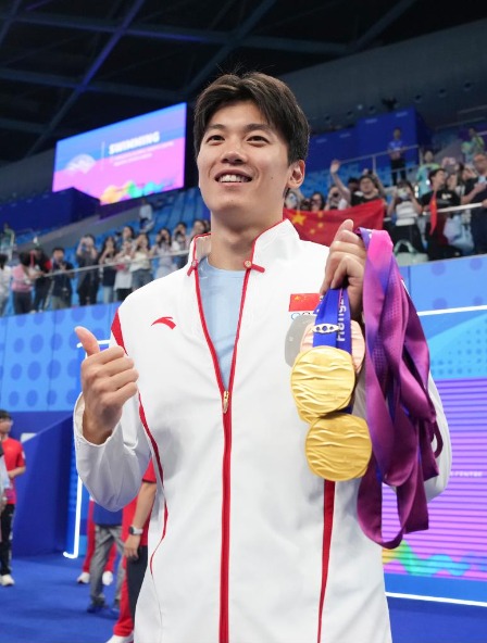 本届亚运会开幕式上,奥运冠军汪顺和“数字火炬手”共同点燃亚运会主火炬。开幕后的首个比赛日,他在游泳项目男子200米个人混合泳决赛中,以1分54秒62创造新的亚洲纪录,站上最高领奖台。经历了运动生涯的起伏,汪顺赛前就憋着一股劲要在家门口取得好成绩,最终心愿得偿,在他的第四次亚运之旅中收获4金1银1铜。