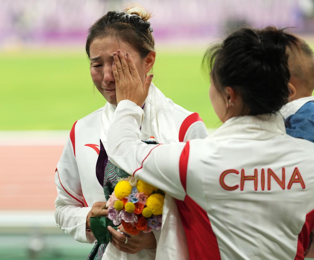 10月4日,切阳什姐(左)在递补奥运奖牌颁奖仪式后落泪。新华社记者 孙非 摄