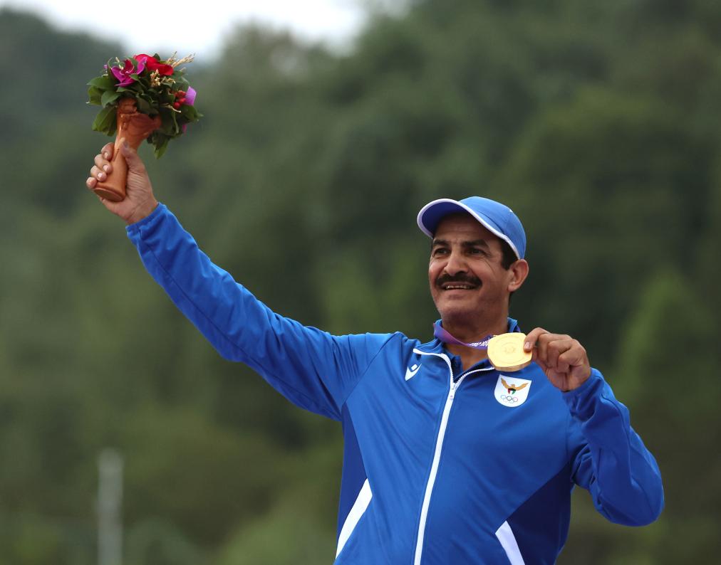 9月27日,杭州亚运会男子双向飞碟个人决赛在杭州富阳银湖体育中心举行。金牌得主科威特选手阿卜杜拉·拉希迪在颁奖仪式上。新华社记者 杜潇逸 摄